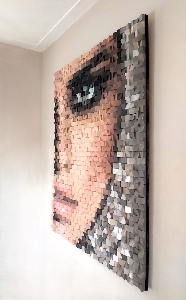 Adriana Lima: Schoonheid in Licht en Textuur Met zorgvuldig geschilderde houten blokjes komt dit half-face portret van Adriana Lima tot leven. Het spel van licht en schaduw accentueert haar tijdloze elegantie, terwijl de abstracte compositie een moderne interpretatie van haar uitstraling geeft. De unieke structuur en textuur maken van dit kunstwerk een blikvanger in elke ruimte.
