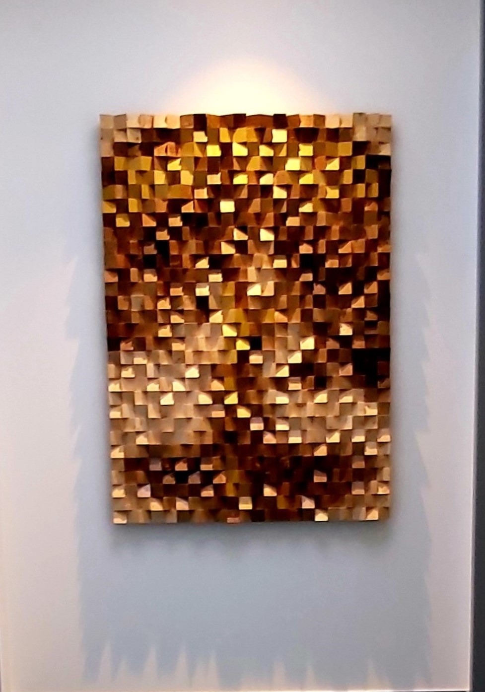 Sophia Loren: Tijdloze Schoonheid in Licht en Structuur Dit portret van Sophia Loren is opgebouwd uit schuine houten blokjes, zorgvuldig gezaagd en geschilderd met acryl- en spuitverf op waterbasis..Door het verder inzoomen op haar expressieve gelaatstrekken...